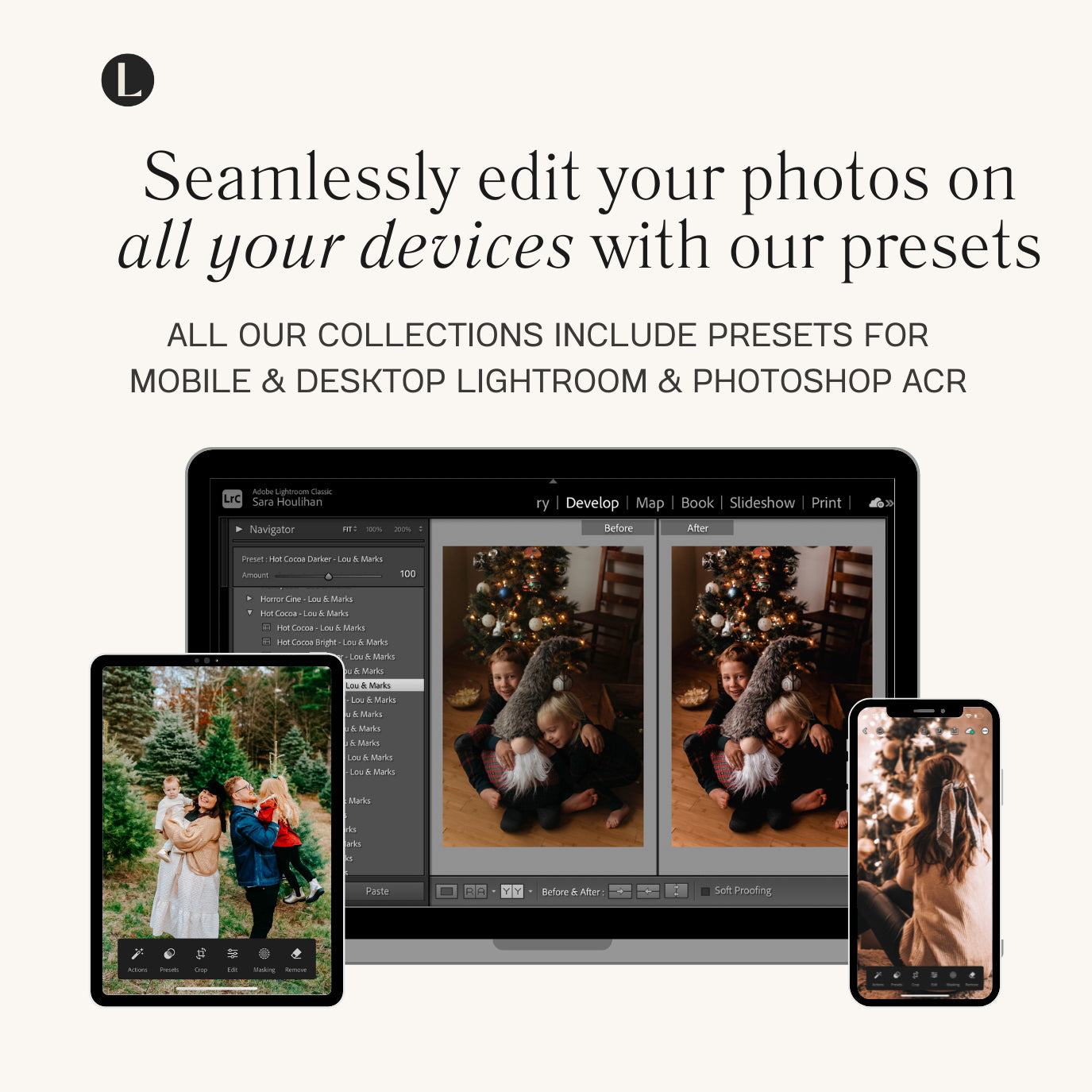 Includes Presets For Mobile & Desktop — Our presets are compatible with the Free Lightroom Mobile App For iPhone & Android + All versions of Lightroom Desktop, Photoshop CC, Mac & Windows, so you can seamlessly edit your photos on all your devices. Includes dng files, xmp files, and lrtemplate files.
