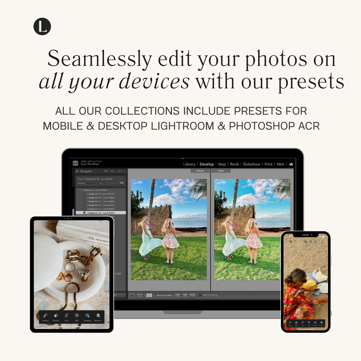 Includes Presets For Mobile & Desktop — Our presets are compatible with the Free Lightroom Mobile App For iPhone & Android + All versions of Lightroom Desktop, Photoshop CC, Mac & Windows, so you can seamlessly edit your photos on all your devices. Includes dng files, xmp files, and lrtemplate files.
