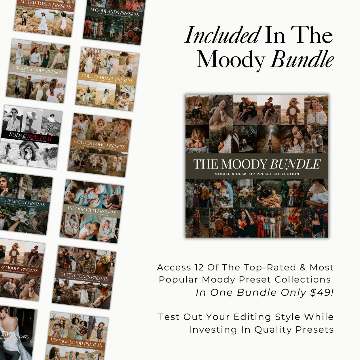 13 Preset Collections Included — moody tones, golden boho, indoor filmcreamy moody, muted tones, rich & moody, moody film, kodak tri-x, woodlands, earthy tones, golden honey, vintage mood, warm & moody