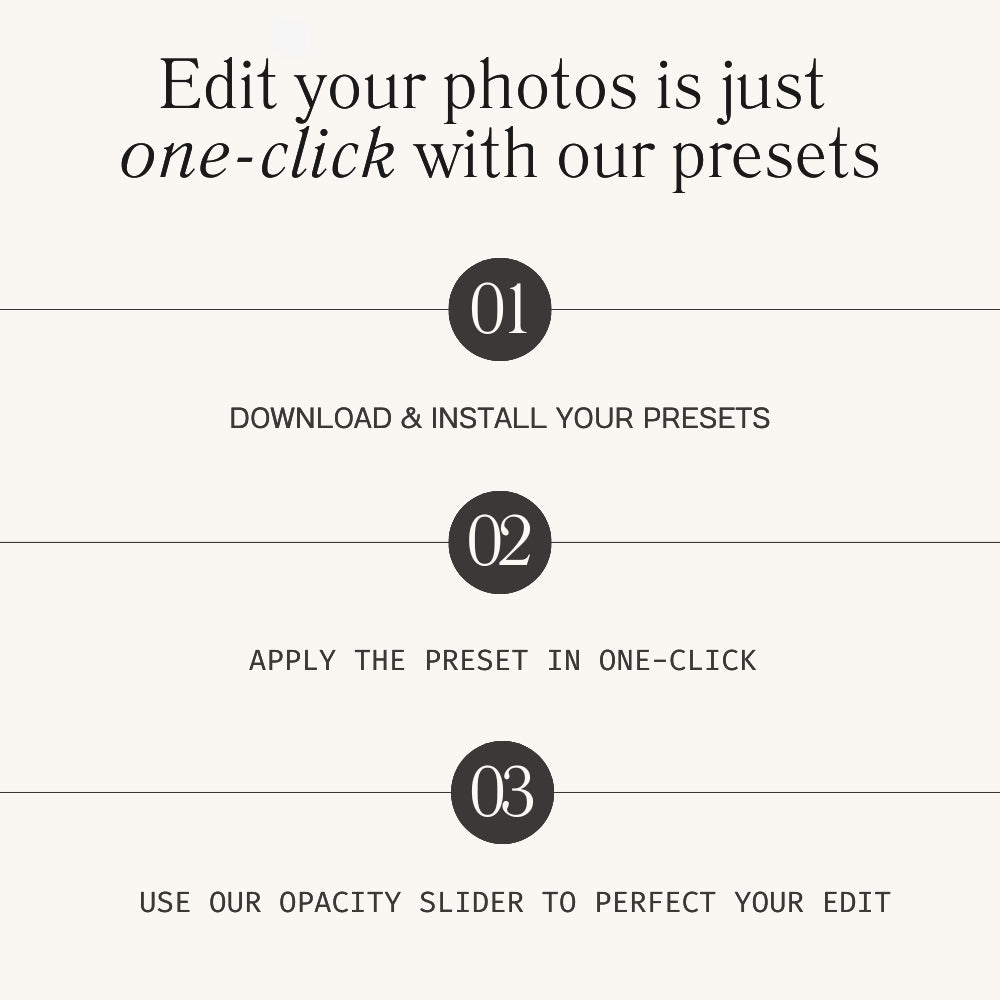 One-Click Edits — Take the guess work out of editing and achieve professional results with the best-selling Lightroom Presets. With one-click of the Preset you will see the magic of photo editing.